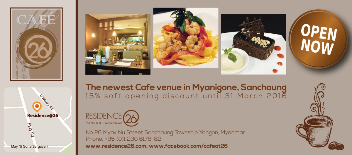 Cafe@26 is central located at Myaynigone - Sanchaung on the first floor of the Residence@26 - Serviced Residence. The Cafe offers a variety of hearty breakfast variations, sandwiches & burgers, Asian dishes, Italian pastas, pastries, cakes, healthy drinks and Coffee creations all day long. Our Free-WiFi Internet Access is provided to all our guest. Come & Enjoy!